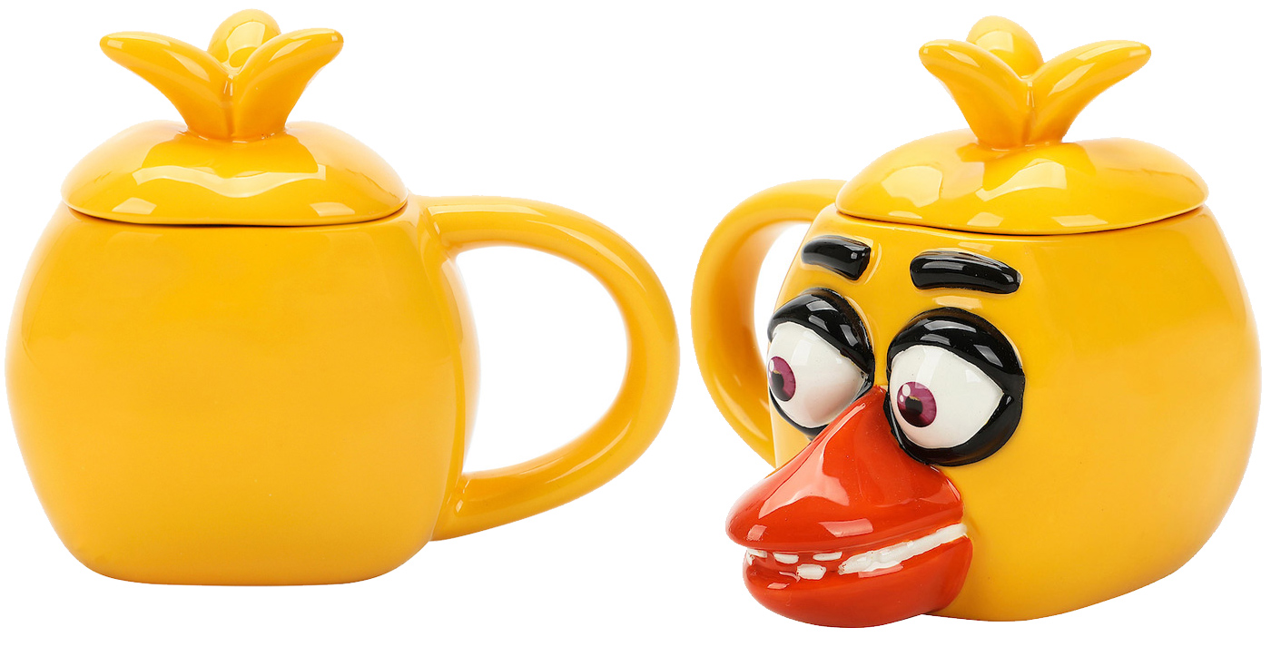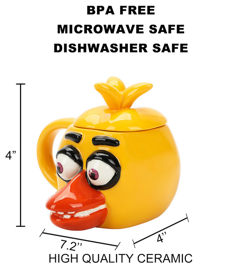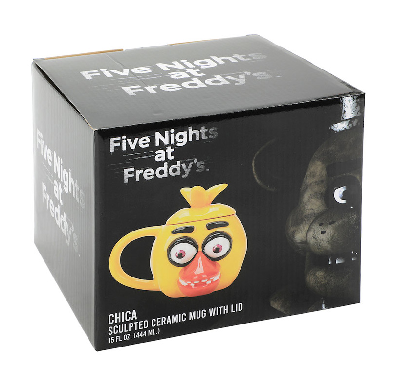 A caneca Chica Five Nights At Freddy’s 16 oz. Sculpted Ceramic Mug tem a forma da galinha amarela animatrônica, uma das figuras mais perturbadoras da série, com bico laranja e topo da cabeça servindo como tampa removível para manter o café quentinho. Tem capacidade para 475 ml e mede 12,3 cm de altura.