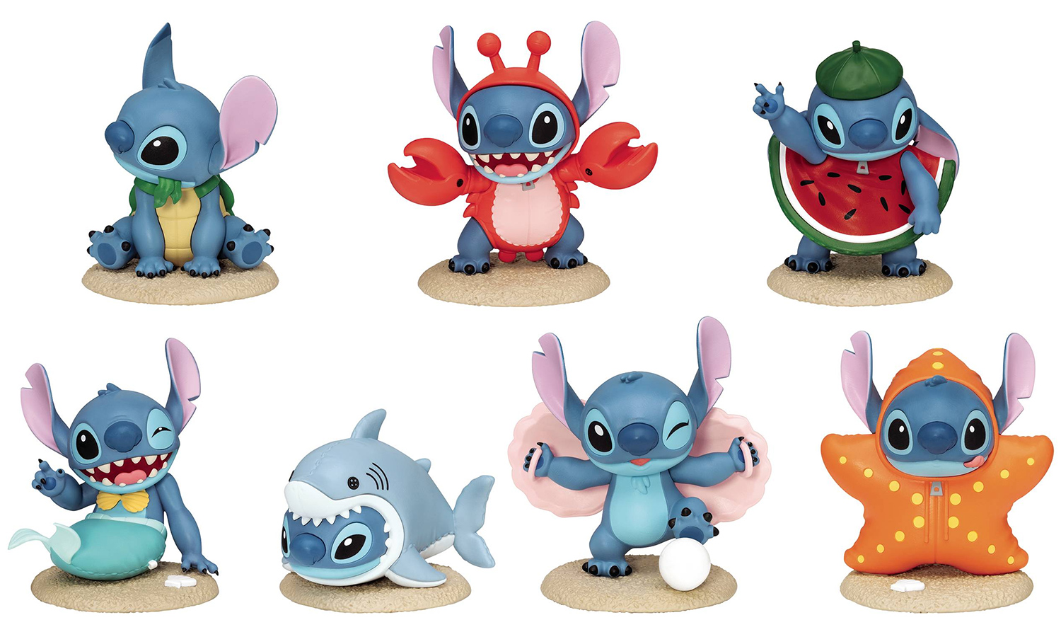 O set Stitch “Summer Dress Up” Series Mini Egg Attack Mini-Figures Blind Box Set (MEA-068) tem 7 mini-figuras do alienígena azul com diferentes fantasias de verão para divertir a praia: Stitch Caranguejo com garras vermelhas, Stitch Melancia com visual suculento, Stitch Concha com uma pérola gigante, Stitch Tartaruga com carapaça, Stitch Sereia piscando o olho, Stitch Estrela do Mar com fantasia de corpo inteiroe e Stitch Tubarão Branco (Edição Limitada) “Eu não sou o Experimento 626, eu sou o rei do oceano!”.