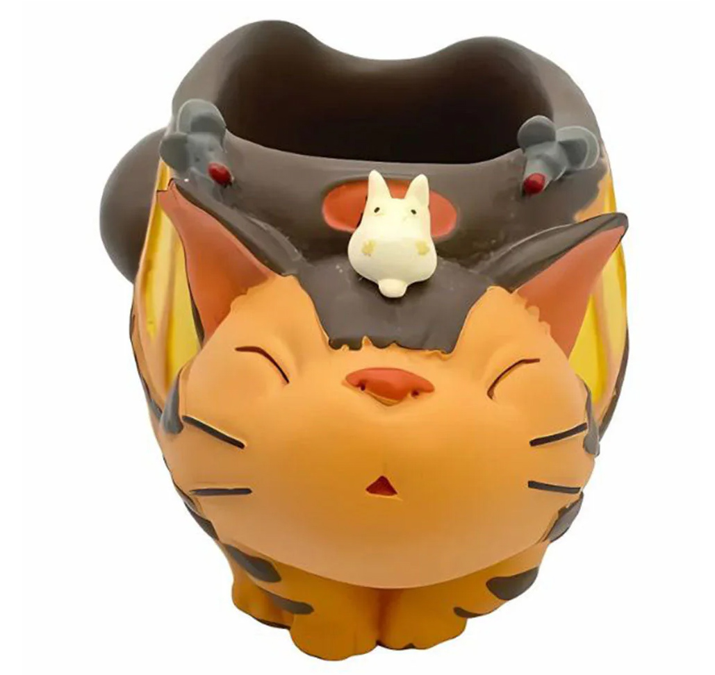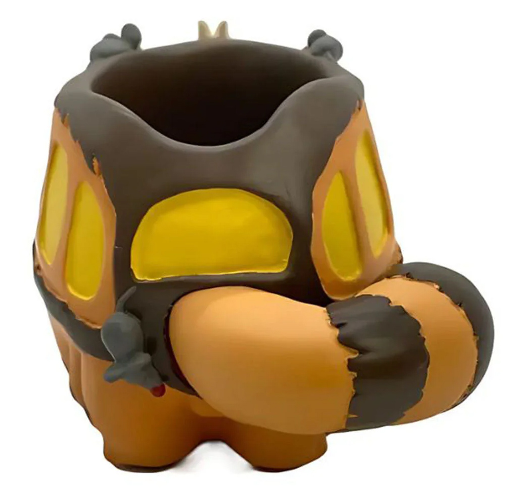O porta-lápis Cat Bus My Neighbor Totoro Pen Holder tem o formato da icônica criatura mágica em forma de gato gigante cujo corpo funciona como um ônibus peludo, com janelas, olhos faróis e várias patas. O Ônibusgato é invisível para a maioria dos humanos e serve como meio de transporte para espíritos e crianças, ajudando as protagonistas em momentos importantes da história.