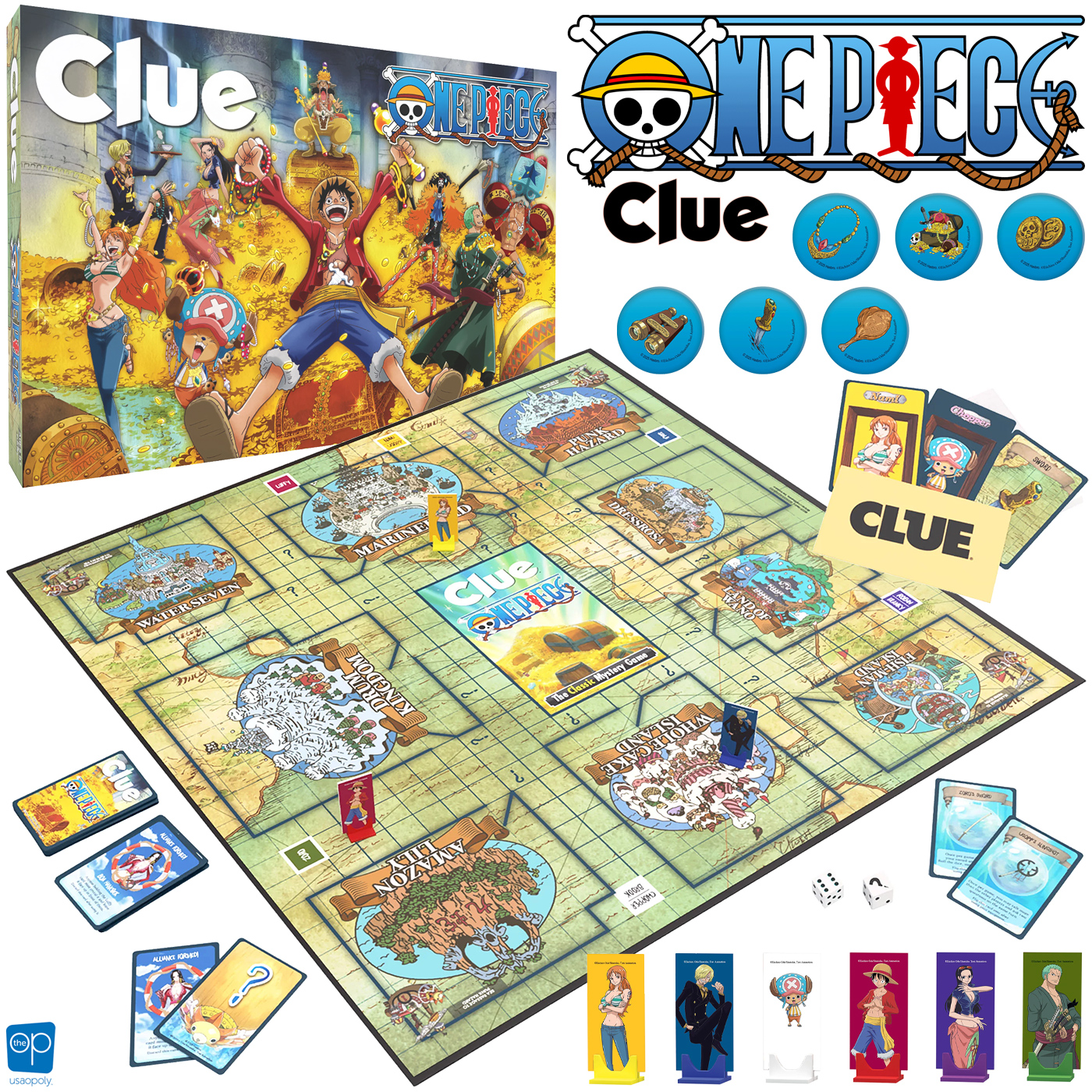 O jogo One Piece Clue Board Game tem o tabuleiro populado com diferentes ilhas dos quatro mares, incluindo Waterseven, Punk Hazard, Whole Cake Island, Drug Kingdom, Amazon Lily, Fishman Island e Land of Wano entre outras e faz 3 perguntas que os Piratas do Chapéu de Palha devem responder: QUEM descobriu o tesouro, O QUE é o tesouro e ONDE está escondido?